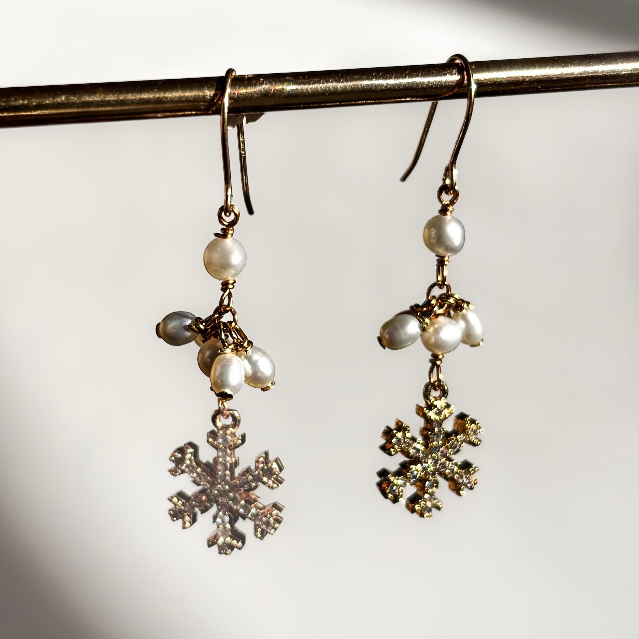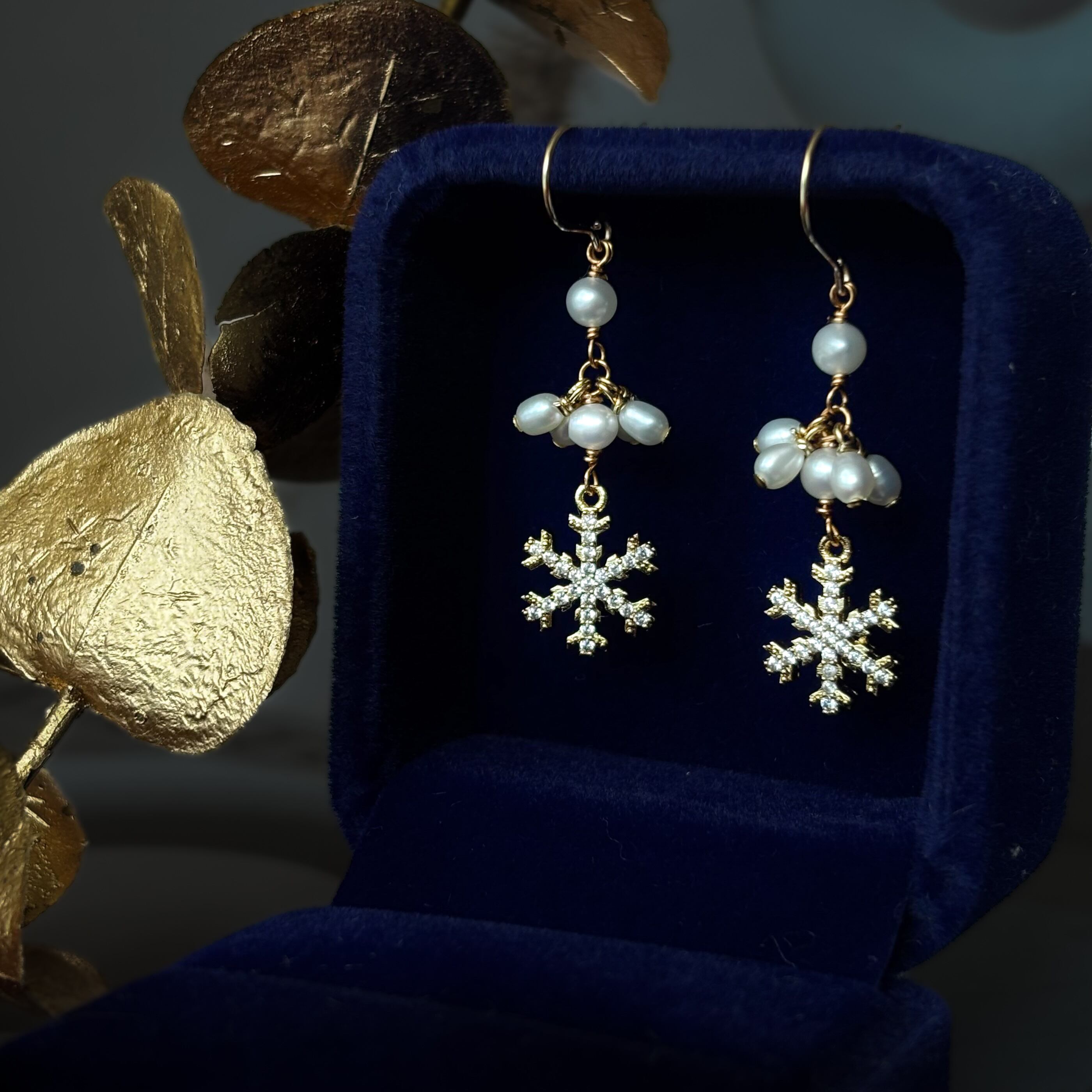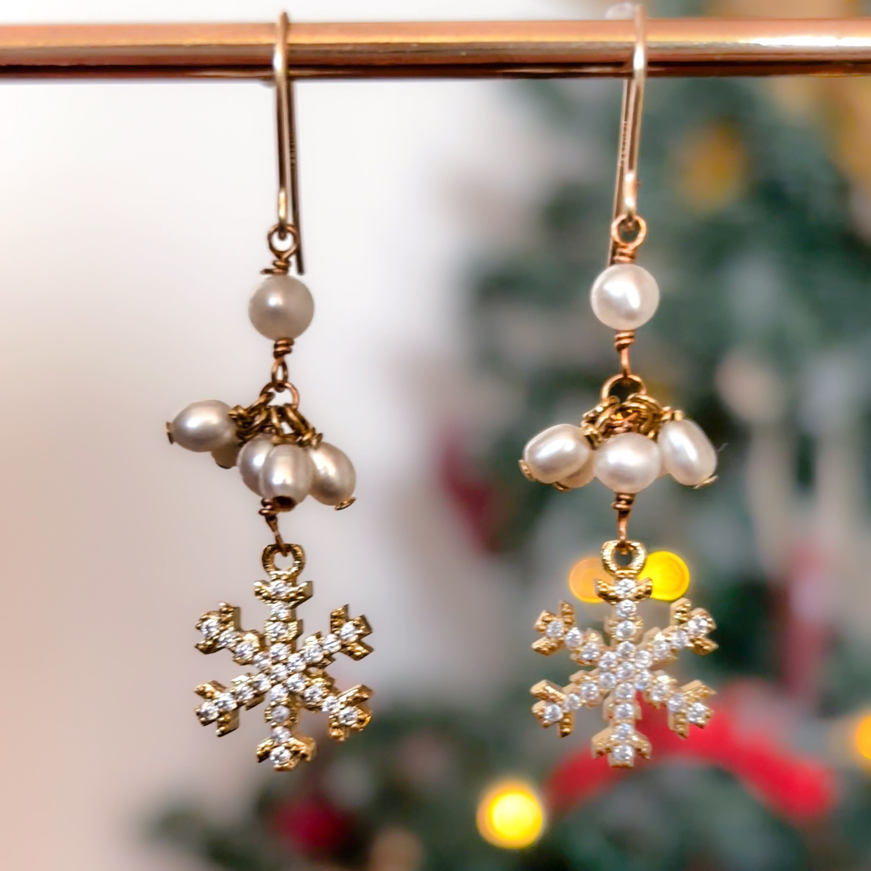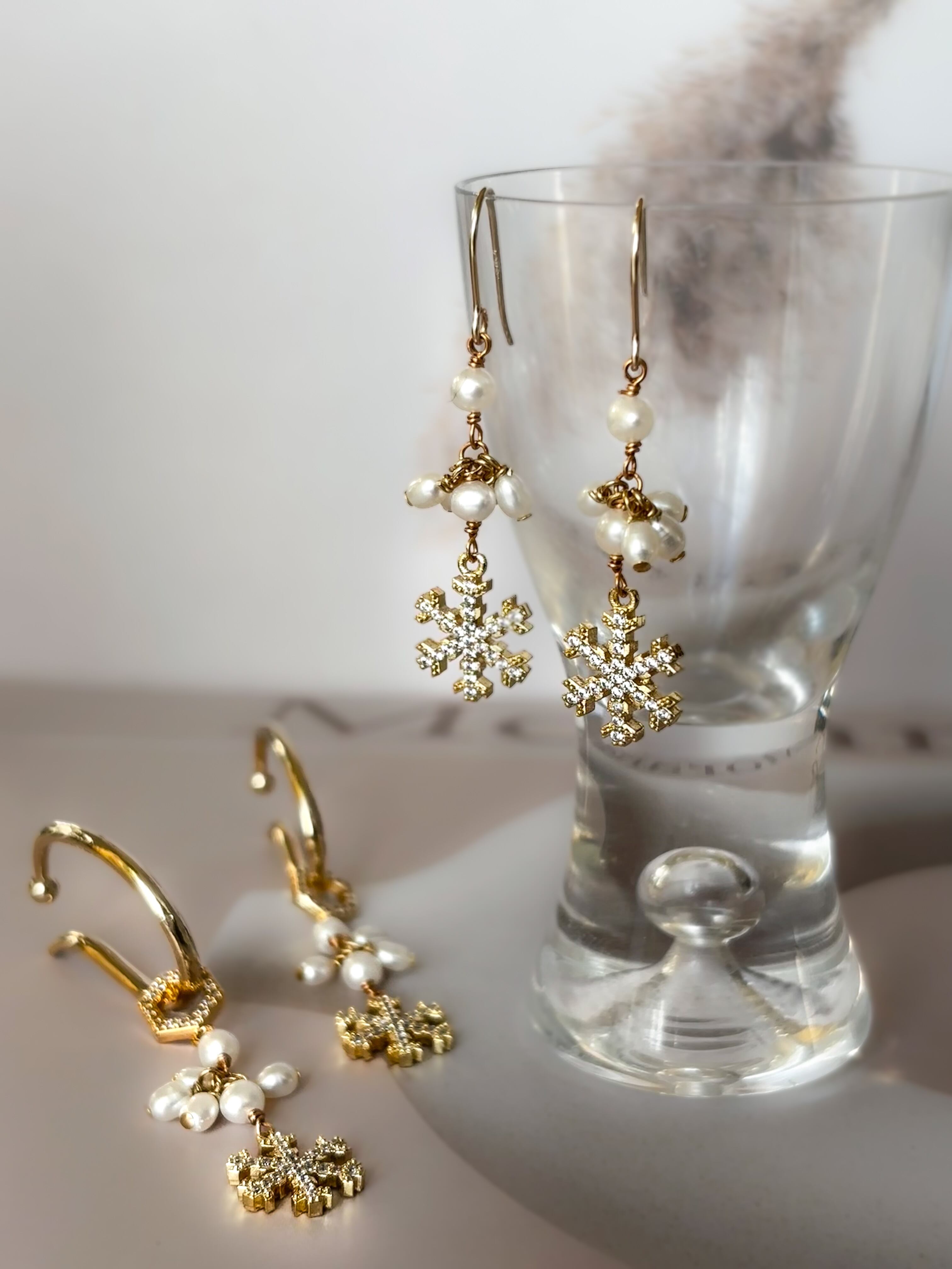 繊細で美しいキュービックジルコニアを散りばめた雪の結晶と、小粒で照りが美しい淡水パールのコントラストが